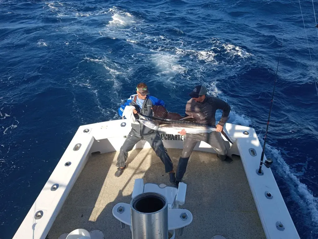 Bluefin Tuna: These are the heavyweight champs of the tuna world, and hooking one is like picking a fight with a Mack truck. We're talking fish that can top 1,000 pounds, though the ones we typically see are in the 100 to 300-pound class - still more than enough to test your mettle. Bluefin are here in the winter months, usually from December through March. They're not just powerful, they're smart too, and landing one of these giants is a true feat of angling skill. The meat is prized by sushi chefs worldwide, but the real prize is the battle and the bragging rights.